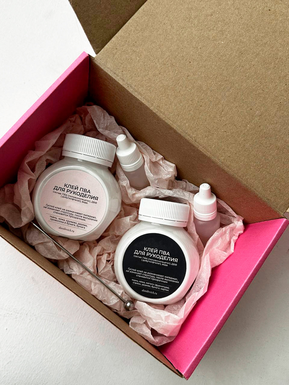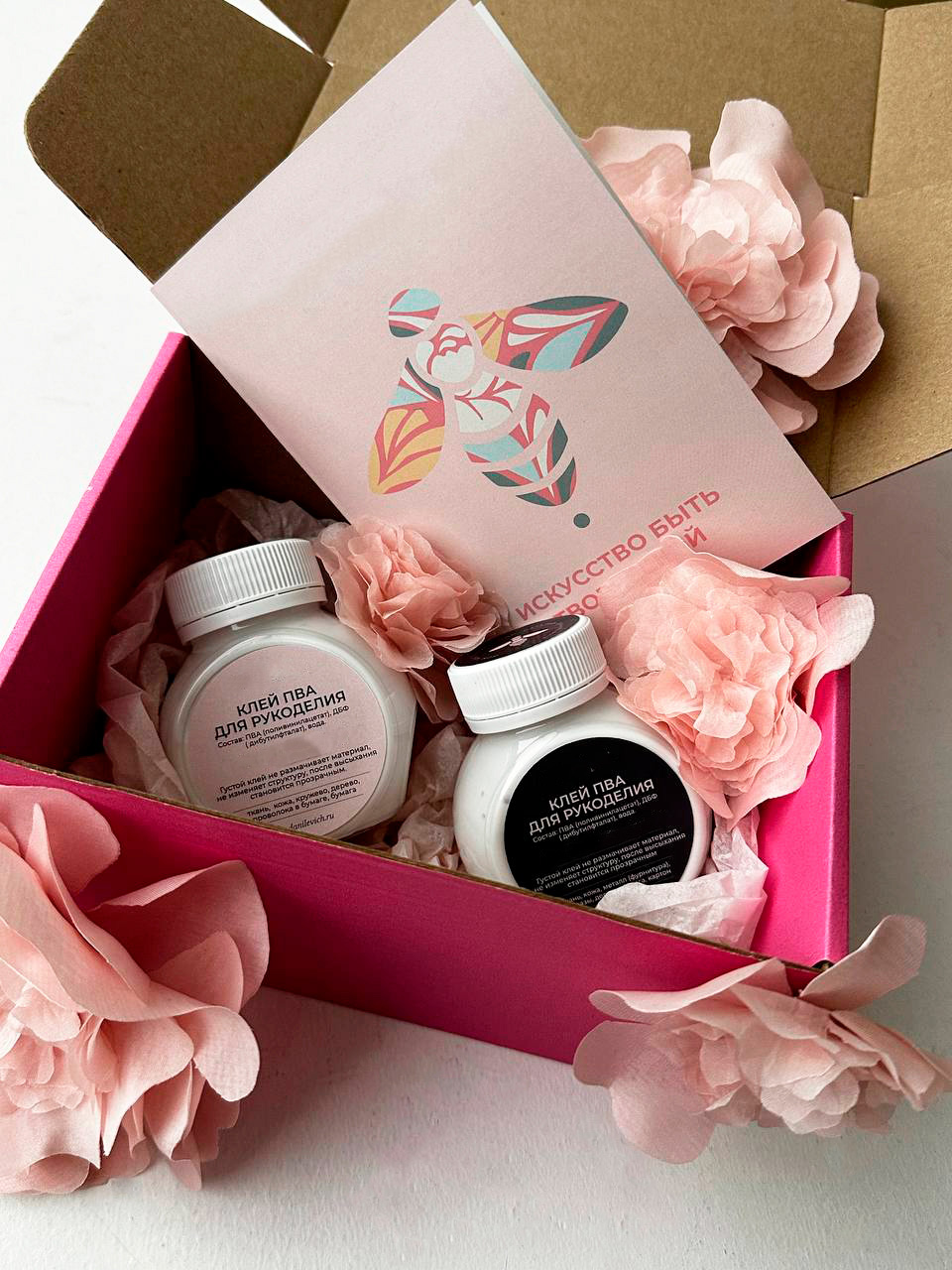 В него входят 2 фирменных клея ПВА для творчества от Дома цветочной моды Натальи Данилевич.