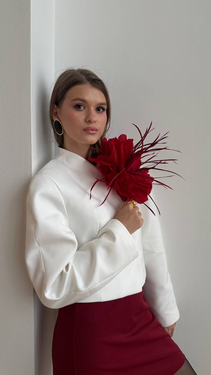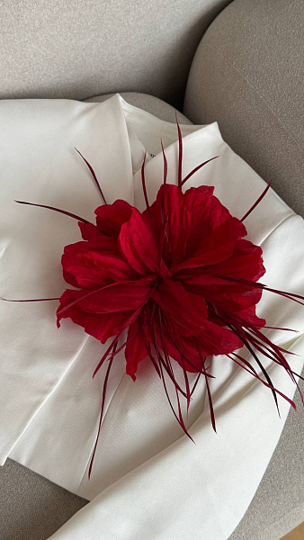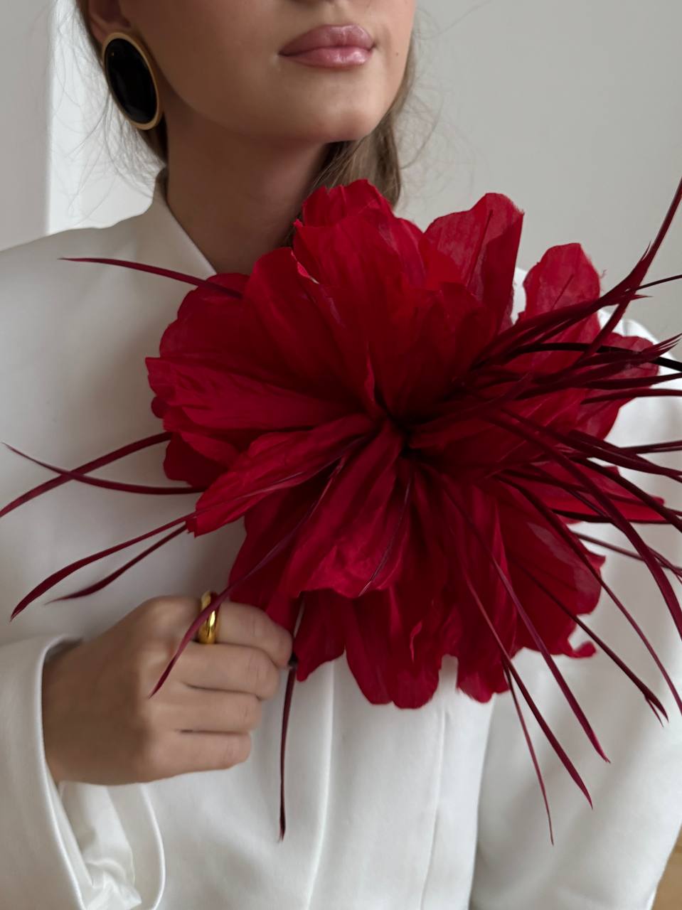 Брошь «Аделина» создана, чтобы притягивать восхищённые взгляды. Объёмный цветок насыщенного красного оттенка выполнен из натурального шёлка, а декоративные гусиные перья добавляют образу изысканности и воздушности. Каждый лепесток имеет гибкое основание – вы можете придавать цветку разные формы, создавая идеальный силуэт под свой образ.