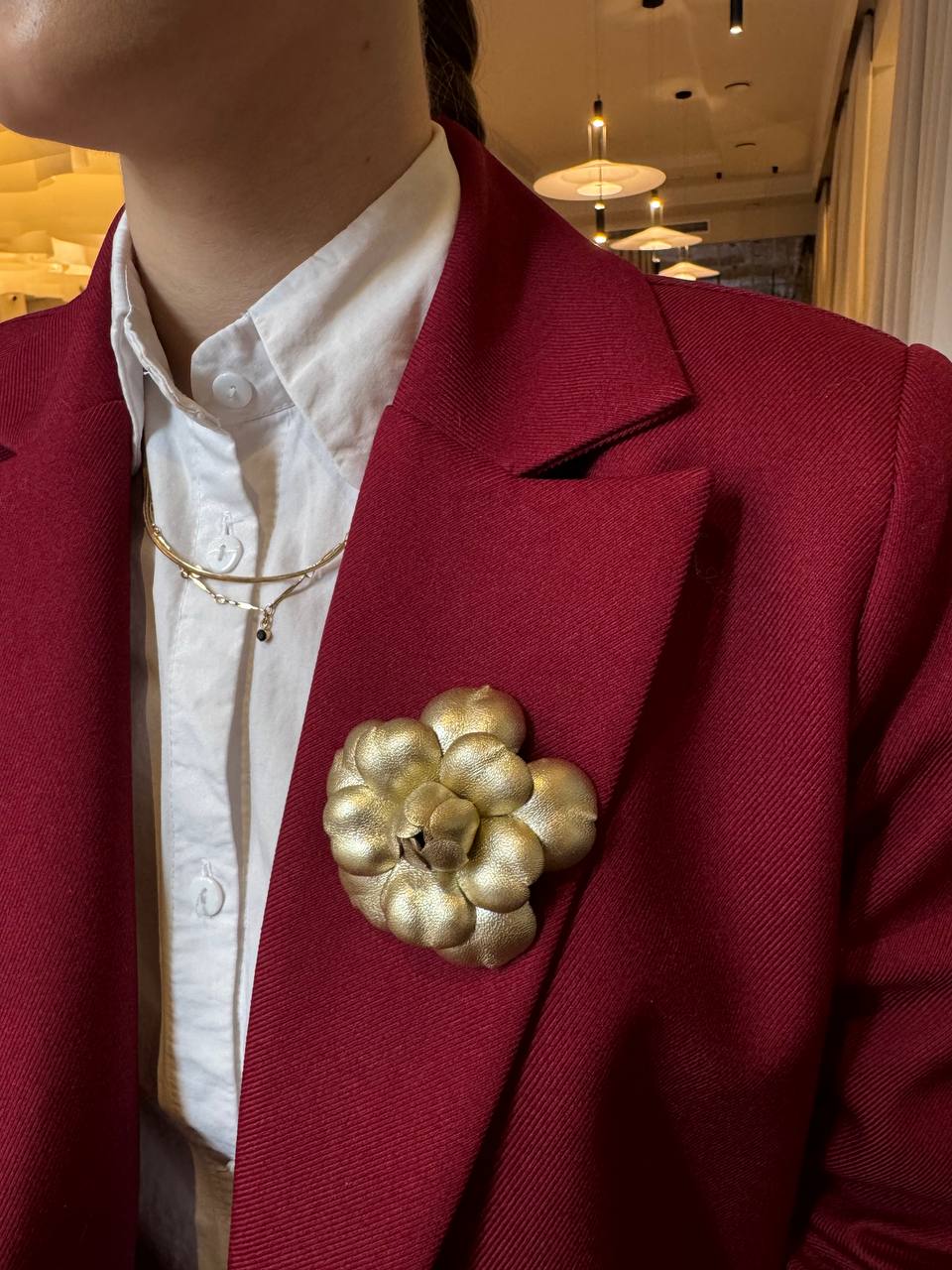 Элегантная брошь «Камелия» в золотом оттенке из натуральной кожи - изящный цветок диаметром 7 см, воплощающий утончённость и стиль.